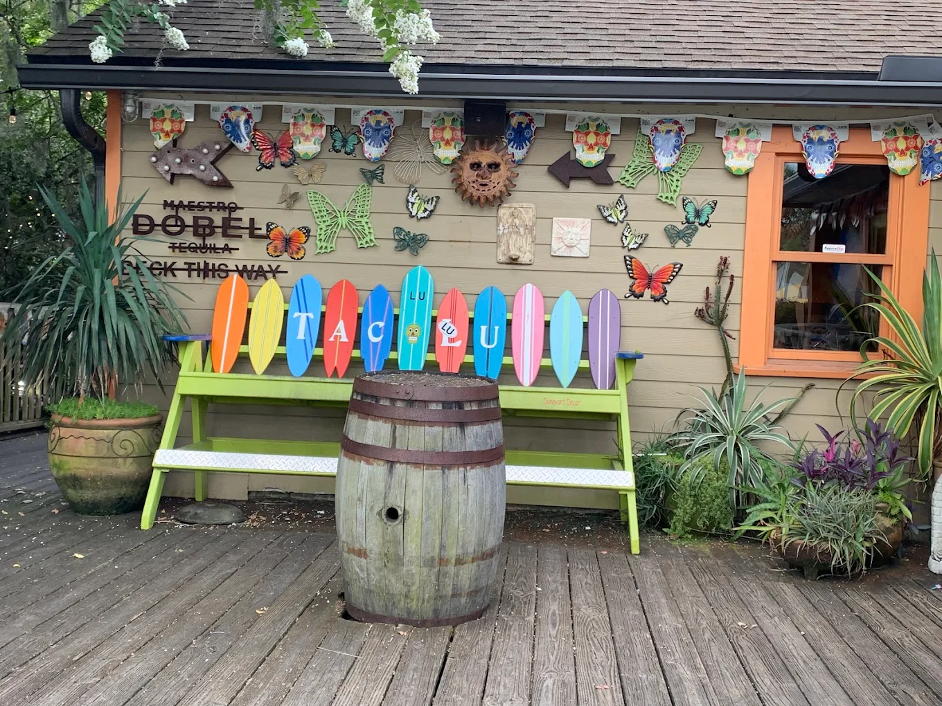 Inside, the vibe is upbeat and unforgettable. Every room glows with eclectic Mexican-themed artwork, string lights, and bold, vibrant colors that make the whole place feel like a celebration. Whether you’re stopping in after a beach day or planning a fun night out, TacoLu hits you with atmosphere from the moment you sit down.