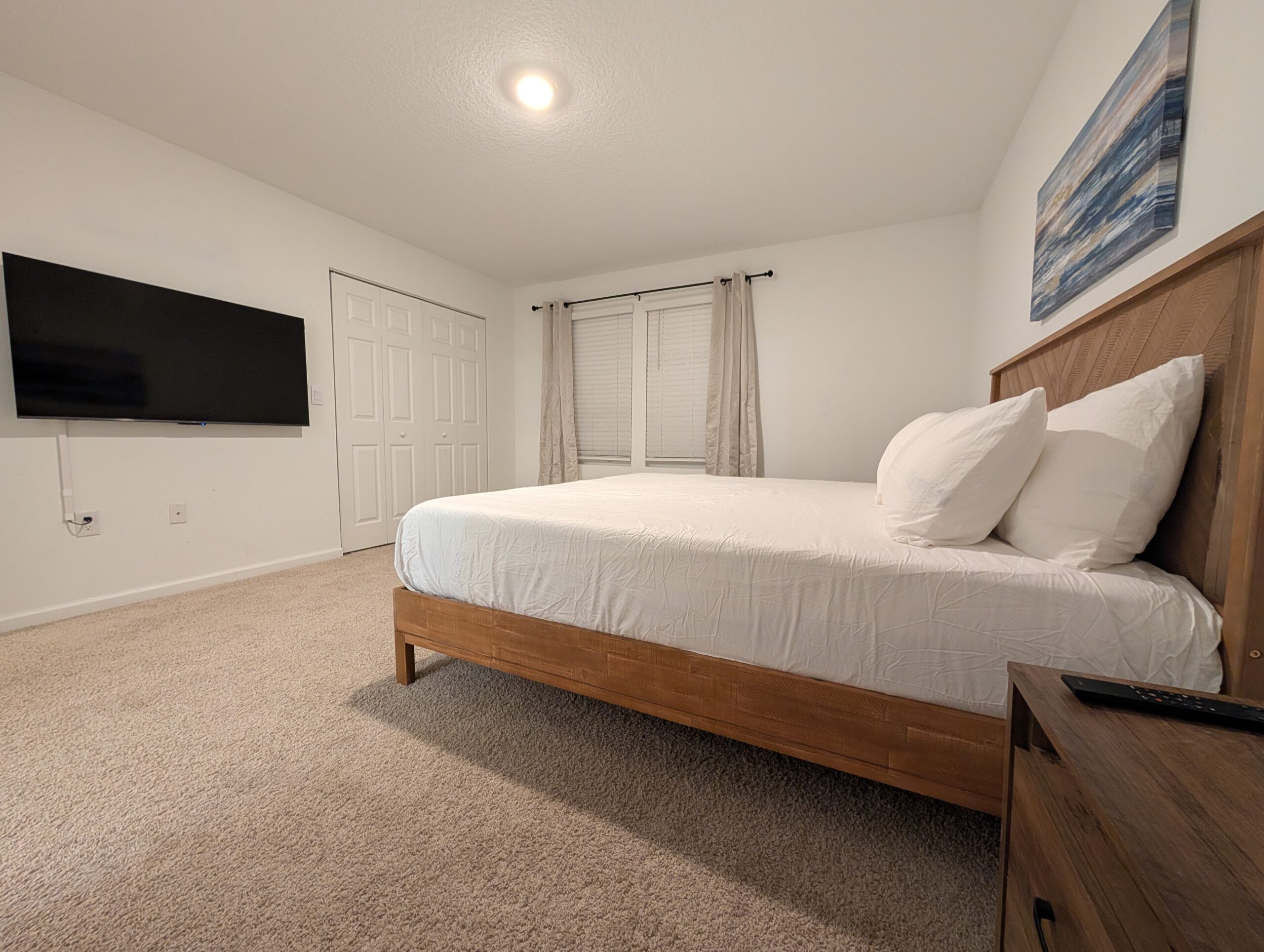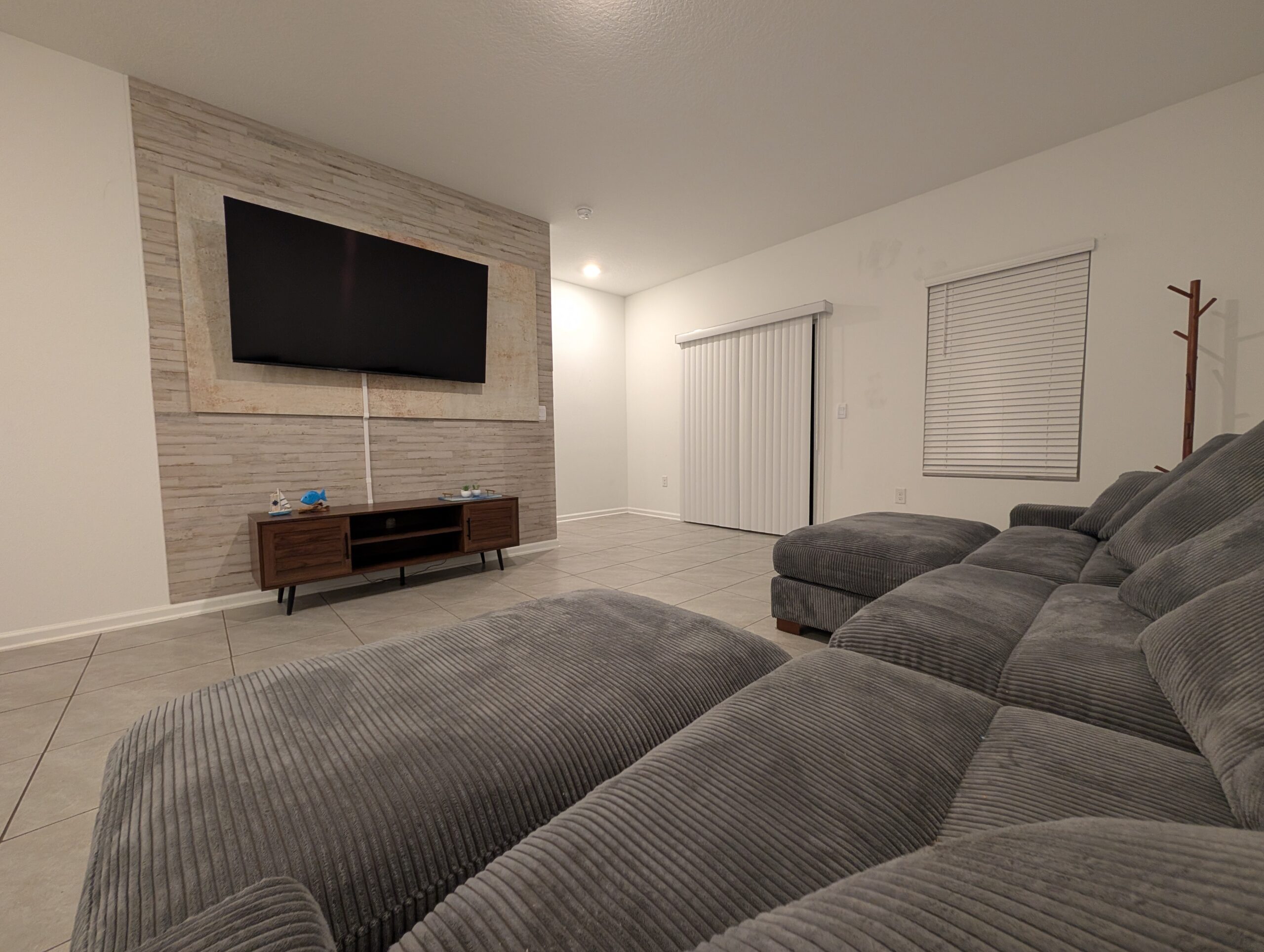- Full view of downstairs with the comfy couch and huge 65 inch TV